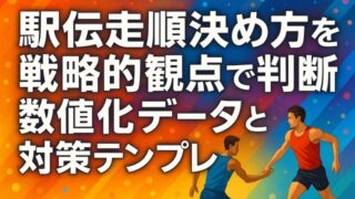 大会・コース 駅伝走順決め方を戦略的観点で判断する為の数値化データと対策テンプレート 1区からアンカーまでの役割を数値化。データ換算とコース特性で最適パターンを提示し、当日入替や風・気温補正まで網羅。迷わず決められる駅伝走順の決め方 2025.09.24 大会・コース