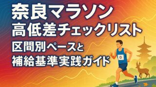 大会・コース 奈良マラソン高低差チェックリスト|区間別ペースと補給基準実践ガイド 奈良マラソンの高低差を区間別に可視化し、登坂と下りの勾配に合わせたペース配分・補給・装備の実務基準を提示。等努力配分の作り方や下り耐性のフォーム、GPX活用の再現練習で失速と脚攣りを予防します。 2025.09.19 大会・コース