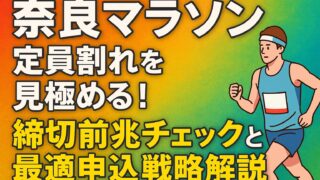 大会・コース 奈良マラソン定員割れを見極める!締切前兆チェックと最適申込戦略解説 奈良マラソンの「定員割れ」は本当かを実務視点で検証。募集方式や県民枠の有無、競合大会やアクセス等を整理し、締切の前兆サインと席取り戦略、宿泊・交通の同時確保まで具体化。迷わず判断できる早見表付き。 2025.09.19 大会・コース